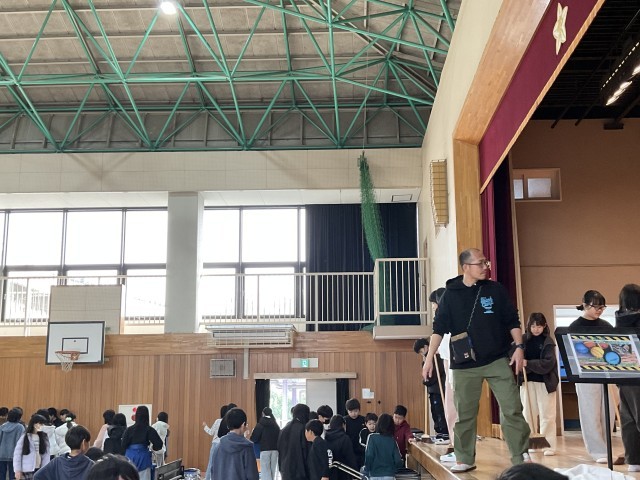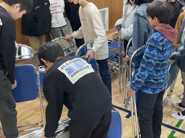 壇上では、清掃と演台の用意、脇では、イスが着々と出されています。