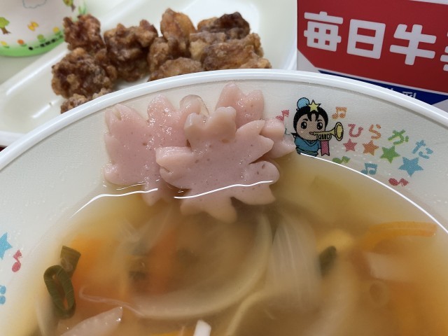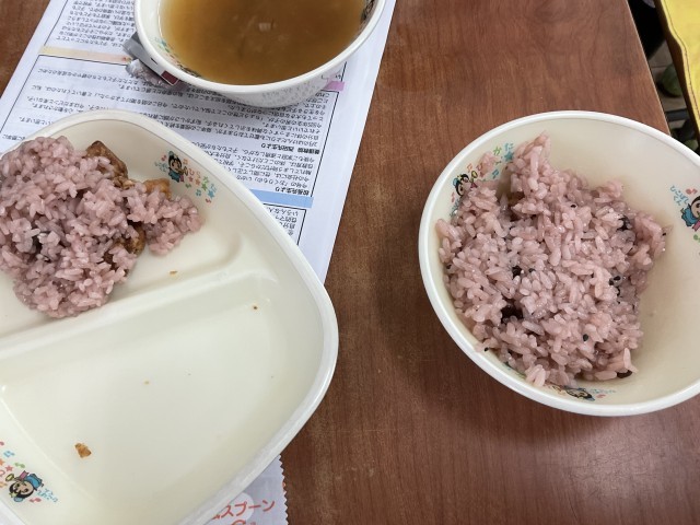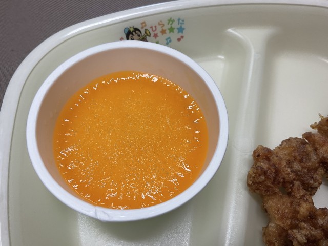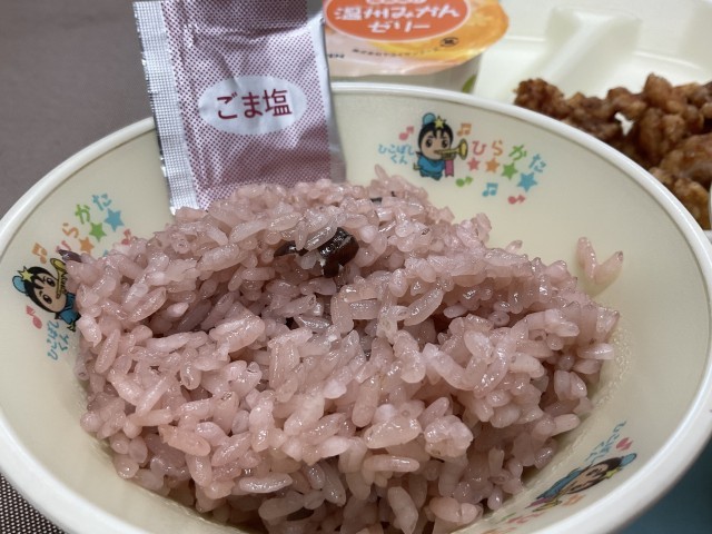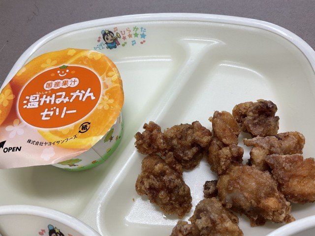 お祝い御膳は、から揚げ、お祝いすまし汁、お赤飯とみかんゼリー。