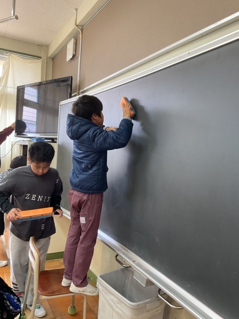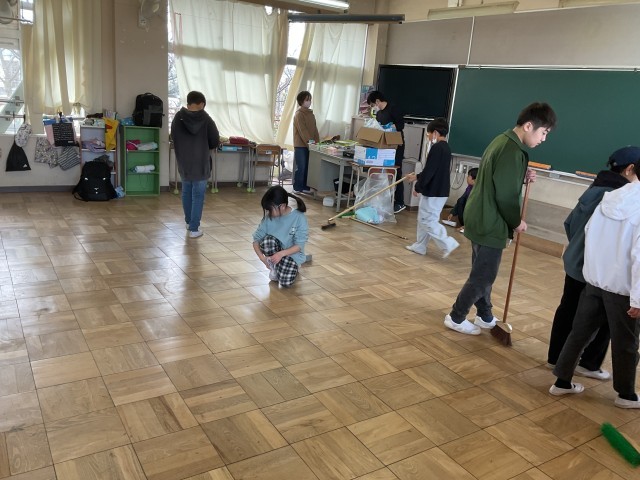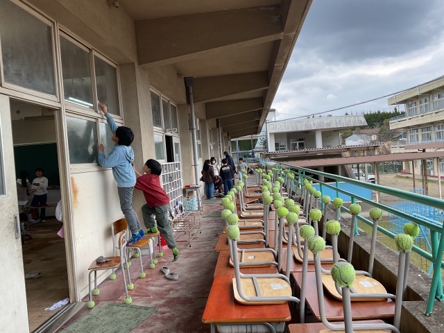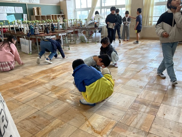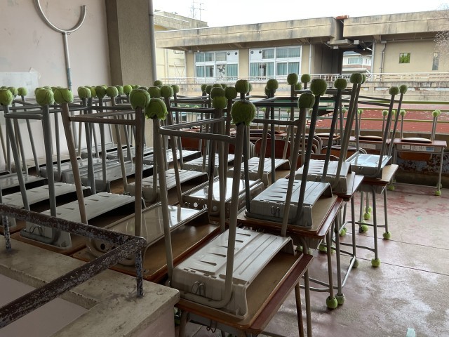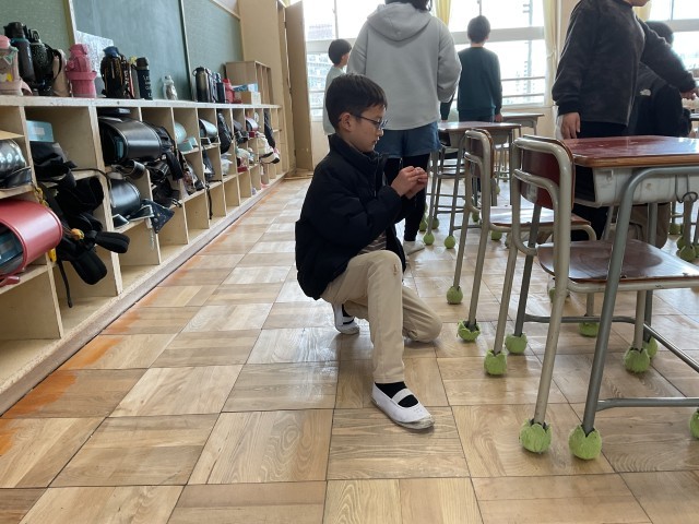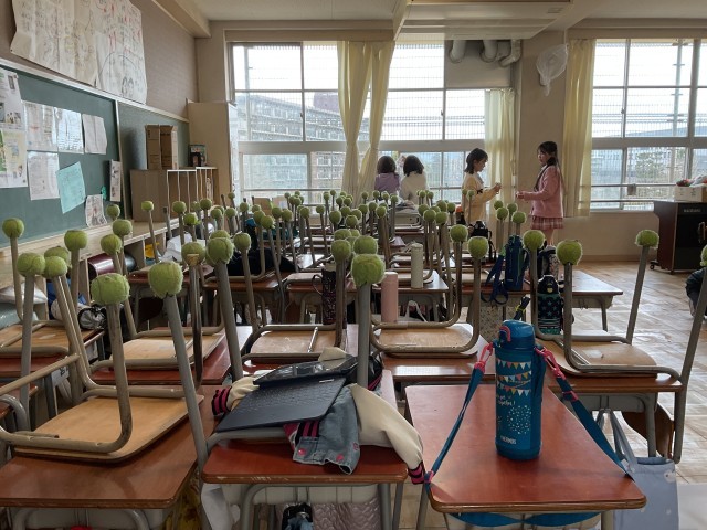 机が廊下に並んでいる間に、教室に床にワックスをかけます。
