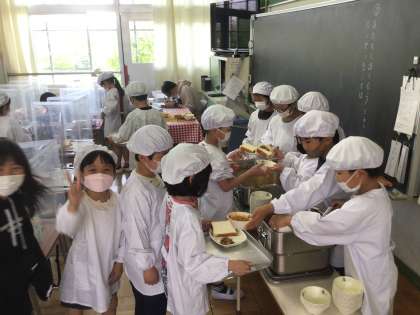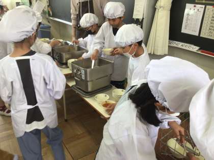 現場では、あえて少なめに盛って、そこから希望者の器に追加して行って余すところなく給食を堪能しようという作戦のようです。