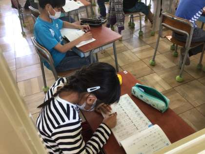 3年生の教室で新しい漢字ドリルに取り組んでいます。
