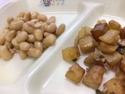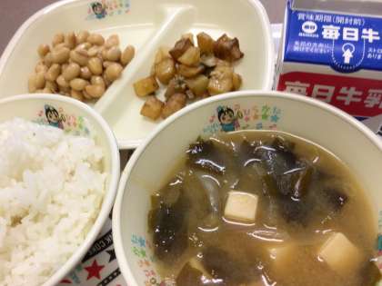 給食だよりによると、小さなつぶつぶが、ぶどうに似ているところから、煮た大豆を「ぶどう豆」と呼ぶそうです。