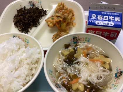 【6日木曜 やっときたひこぼしくん!七夕記念のメニュー】 公開日 2023/07/06 更新日 2023/07/06 給食を食べよう! 給食は、A、B校がありまして、かわりばんこに同じメニューになります。 ですので、今日は一日早い七夕メニューです。 そうめんが天の川、黄色のかまぼこが「星」です。 天の川は、ちょっとぶよっとしています。。。 カリッとかき揚げ、ひじきのふりかけ。美味しそうでしょう! いいね(0)