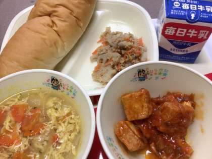 【30日月曜 アレルギー対応 卵とコーンのスープ】4 公開日 2023/10/30 更新日 2023/10/30 給食を食べよう! 小おかずは、厚揚げのチリ🌶️ソース、 旬のレンコンのソテーです。 パンによく合いますね。 いつもスープは検食で2杯分食べるので、お腹はチャポチャポ。 ですが、おかずがよくパンに合うので、あっという間に食べてしまいました。 もう一本食べたいなあ。。。 いいね(0)