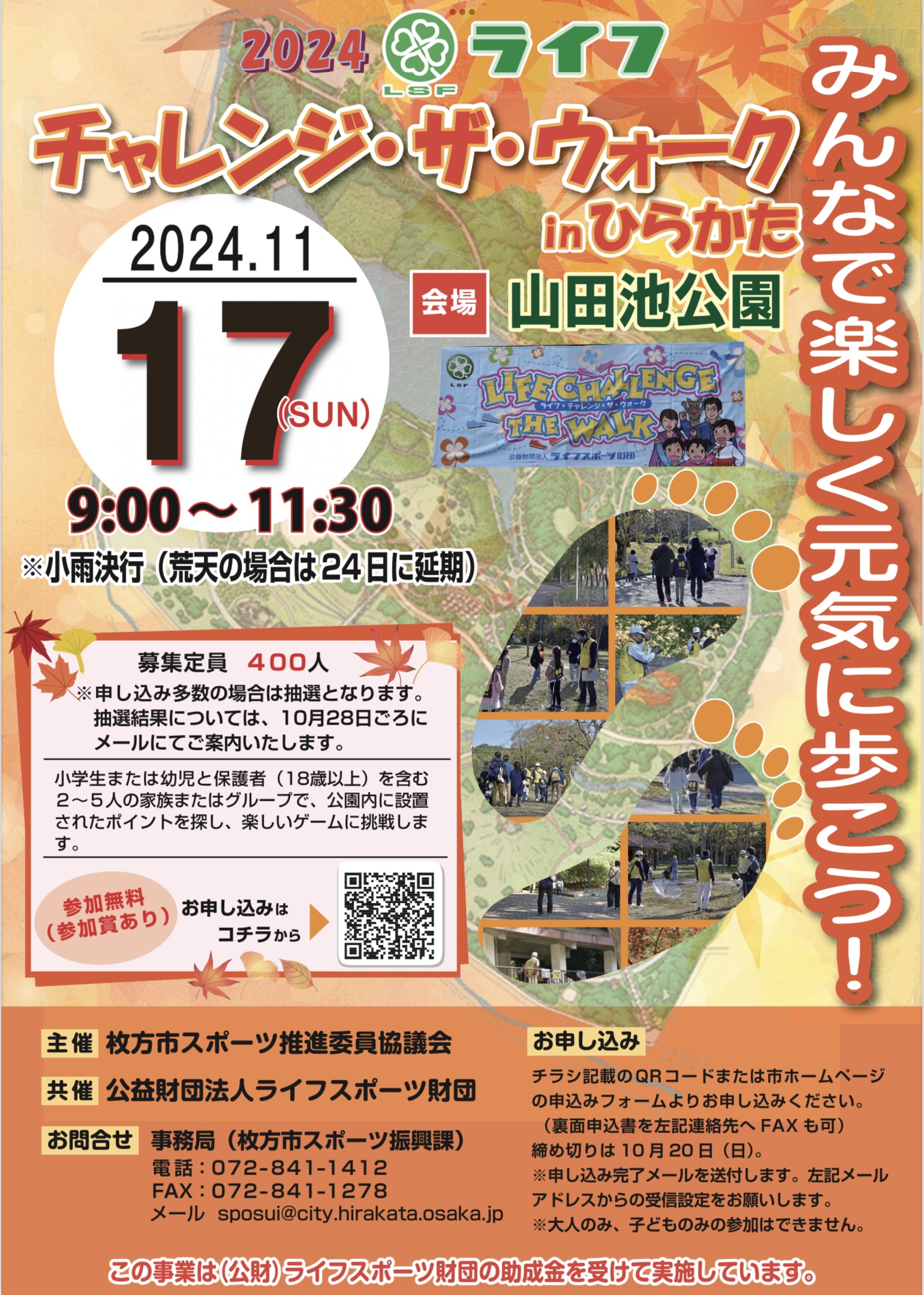 【11/17チャレンジウォークin枚方に応募しよう!】 公開日 2024/09/29 更新日 2024/09/29 お知らせ・緊急連絡 詳しくは、 チャレンジウォークin枚方に応募しよう! 応募は10/20まで! いいね(0)