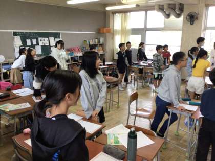【28日月曜 6年生のオビタイム 名物ゼッキョーにもマケズ】 公開日 2024/10/28 更新日 2024/10/28 五常小の日常 月曜朝、もうすぐこのクラスのゼッキョーが始まります。 先生が音量計をつけて、みんなでモニターします。 オビタイム係の児童が、声を枯らさんばかりに範読、奮闘を始めました。 みんなも、その勢いにつられて微笑みながら声を張り上げます。 宮沢賢治名作 雨ニモマケズ こんなに気合いの入った暗唱、気持ちのよいものです。 いいね(0)