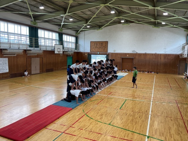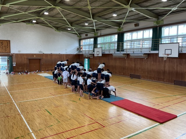 今日の5時間間の6年生の授業の様子です。今日もみんな集中して「組体操」の練習に取り組んでいました。体育館では、大技の練習に取り組み、一人ひとりが集中して技の完成に努めていました。