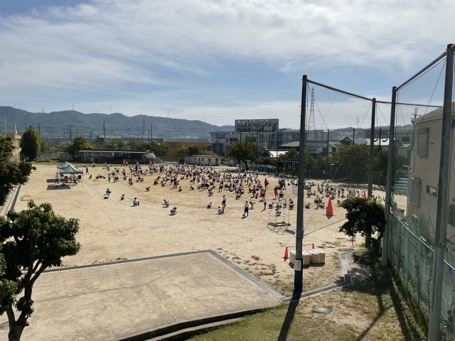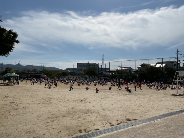 運動会全体練習後に運動場で1、2、5、6年制はトラック内、3〜4年生はトラック外でけがのないように全学年で石拾いをしました。今日も子どもたちは、たくさんの石拾いを頑張りました。