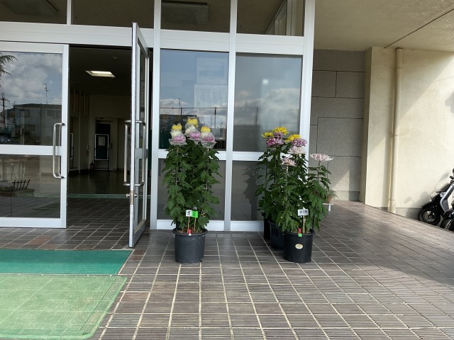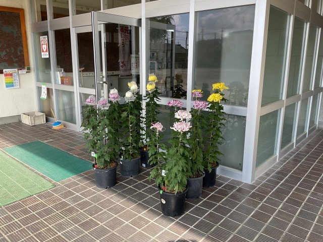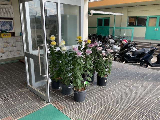 担当の方が定期的に親身になって、学校で丁寧に育ててくれています「大菊3本仕立て」の菊苗が、つぼみもふくらみ開花し、大きく育っています。今年も枚方市菊花展、枚方宿街道菊花祭に出展します。先週に出展菊の候補検討を行い、明日に枚方菊花展、本日に枚方宿街道菊花祭へ搬出します。