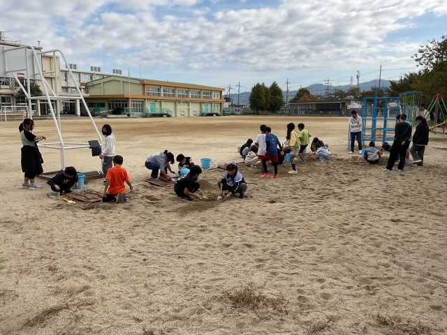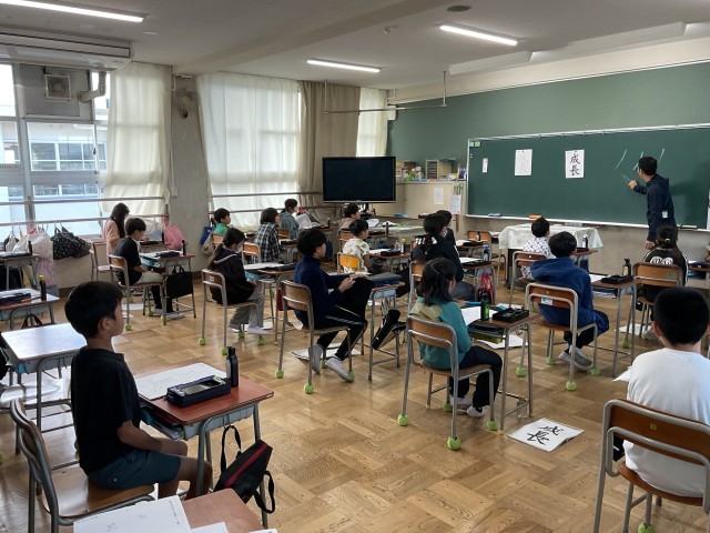 今日の1時間目の5年生の授業の様子です。1組は理科の授業で、「流れる水のはたらき」の学習で、運動場砂場で「流れる水と地面の様子」を再現し、①流れる水には地面をけずったり、土を運んだり、積もらせたりするはたらきがあること、②地面がけずられているところでは流れが速く、土が積もっているところでは流れがゆるやかであることを確認することができました。2組は算数の授業で、「ならした大きさを考えよう」の学習で、より正確な大きさを知る方法を考える学習で、平均で求めていくことを確認し学習に取り組んでいました。3組は書写の授業で、今日の毛筆学習課題は「成長」です。毛筆学習に取り組む前に心を鎮め、先生からの注意事項を静かに聞いて意識を高めていました。