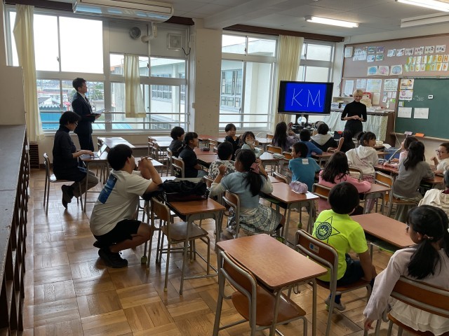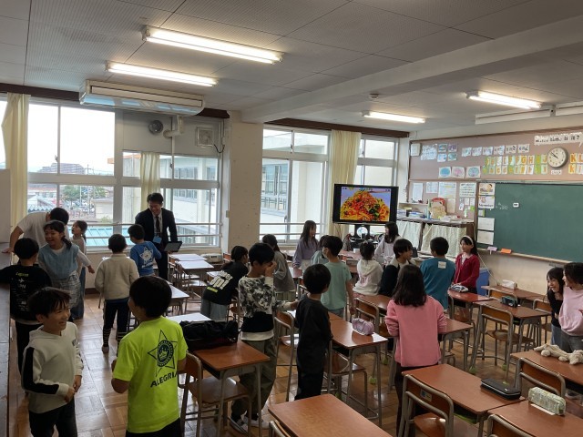 子どもたちは、「Do you like natto pasta?」の質問を聞いて周り、回答して、みんな笑顔で学習に取り組んでいました。大文字のアルファベットが映し出され、対象の先生を考えて発表していました。