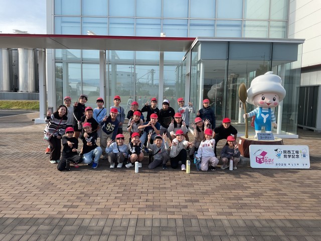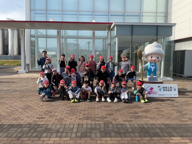 明治なるほどファクトリー関西前で、みんな元気な姿で記念撮影です。5年生のみんなは元気すぎます。今から帰校します。