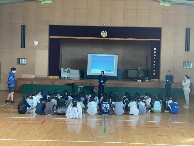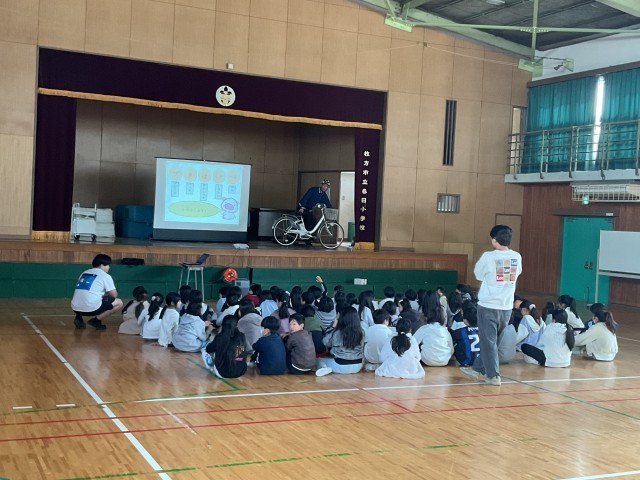 今日の2時間目に3年生は、体育館で枚方自動車教習所の担当者より、自転車交通安全教室の授業を受講しました。自転車の走り方、正しい自転車の乗り方、運転中の安全確認など、実際に体育館で安全な自転車の乗り方や自転車の運転等についての動画を視聴し、自転車の交通安全についての学びを深めることができました。