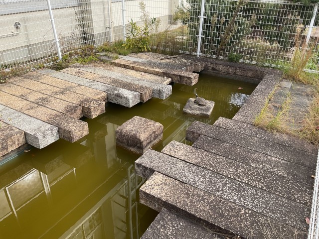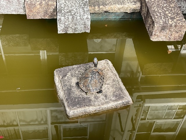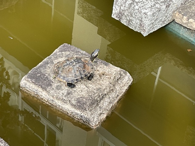 校内観察池の亀がひなたぼっこをしていました。カメは変温動物ですので、自分で体温を維持することができません。 甲羅には「甲板」という薄い層があり、その下に毛細血管が張り巡らされています。 日光を浴びることで血液の循環を促進し、体を温めています。