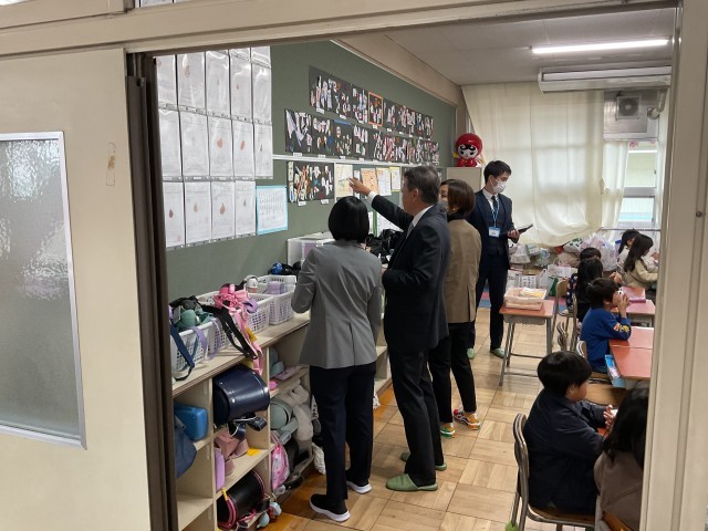教育委員会の教育委員と指導主事、学校運営アドバイザーの皆さまが、子どもたちや先生方が頑張っている様子等を参観してくださいました。その上で、4月からの学校運営の成果や課題について、話をさせていただきました。