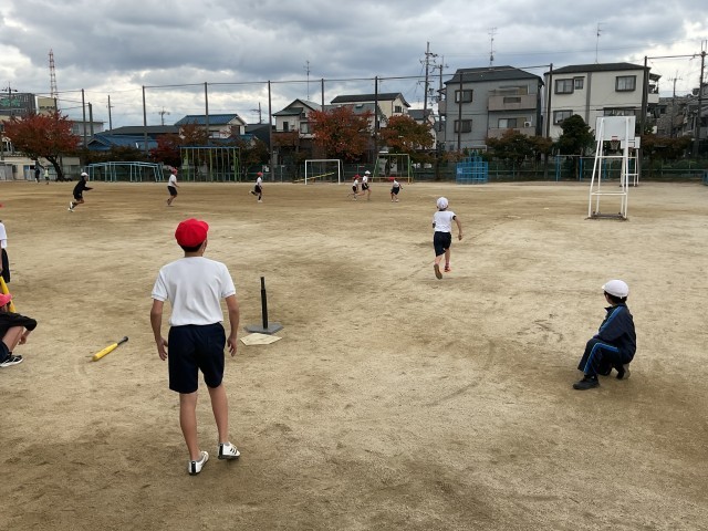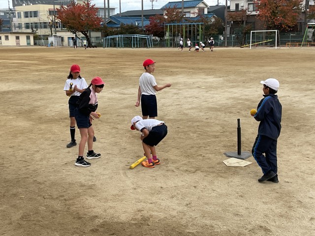 5の1の子どもたちが、体育の時間にTボールに取り組んでいます。