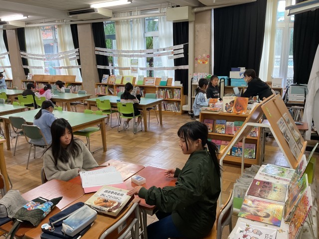 2階の渡り廊下のフリースペース「らくらくベース」で過ごす人、学校図書館で思い思いに本を読む人、