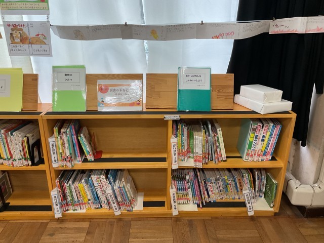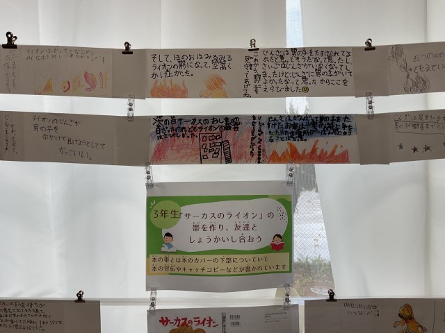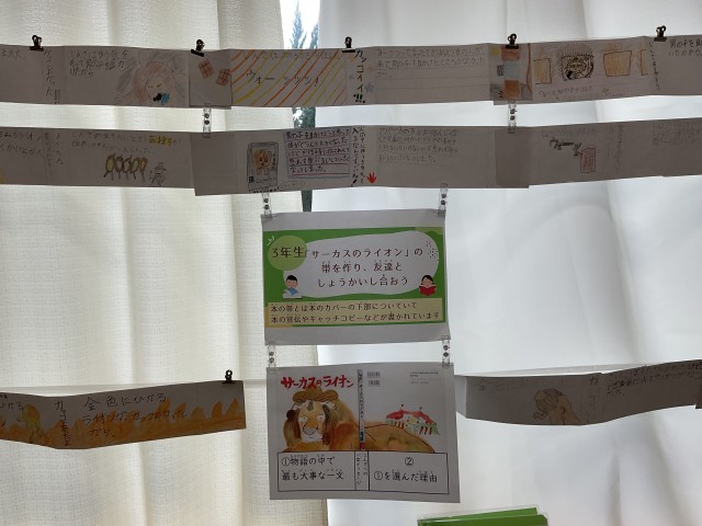 今、学校図書館に、3年生の「本の帯」が展示されています。