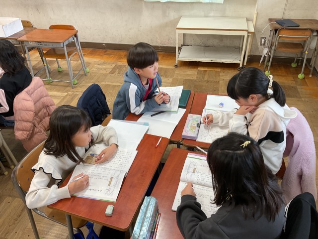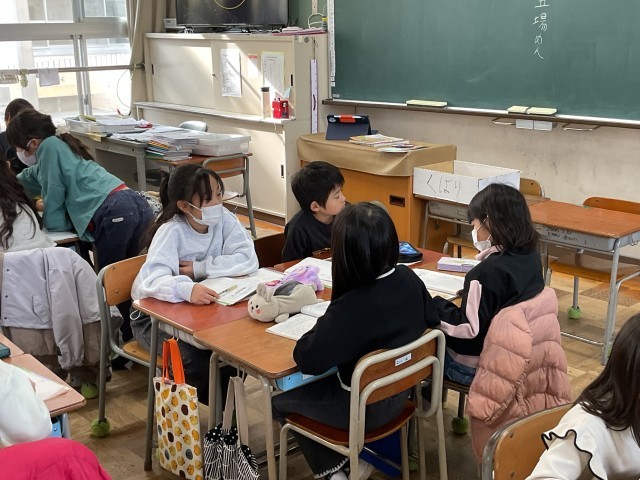 国語の時間です。ものがたり文を、「時間」「人ぶつ」「場所」に着目して、グループで読み合いました。