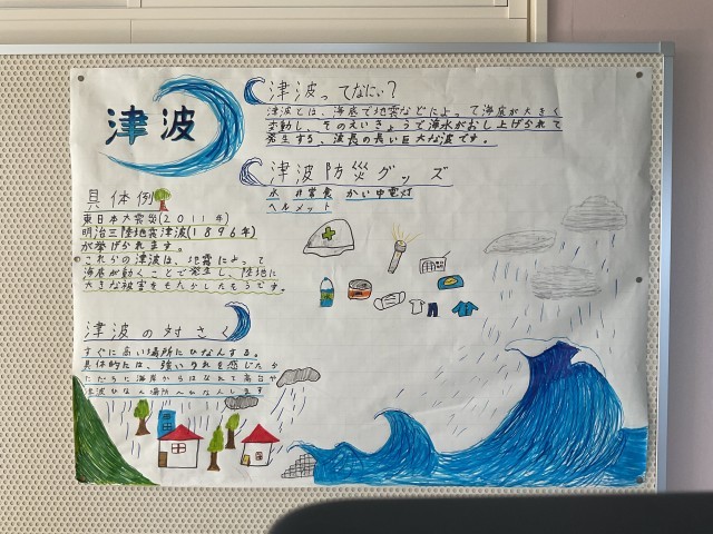 理科室の前に、津波について調べ学習をしたものがありますね。津波が起きる仕組みなど、伝えてくれています。