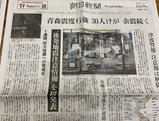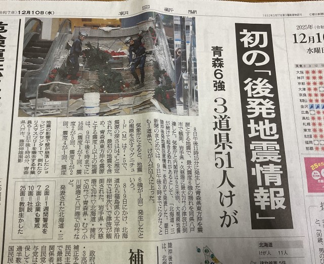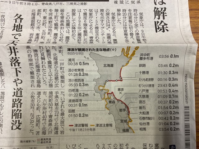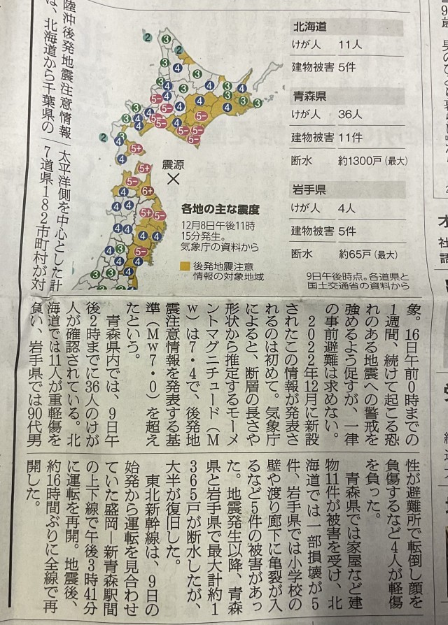 12月8日、午後11時35分頃、青森東方沖を震源としたマグニチュード7.5の地震が発生しました。