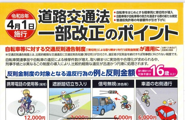 自転車にかかわる法律、覚えておこう! 公開日 2025/12/23 更新日 2025/12/23 お知らせ・緊急連絡 自転車の扱いについて、です。子どもだけでなく、大人も、きちんと知っておきましょう! → 道路交通法一部改正のポイント(R8.4.1施行) いいね(0)