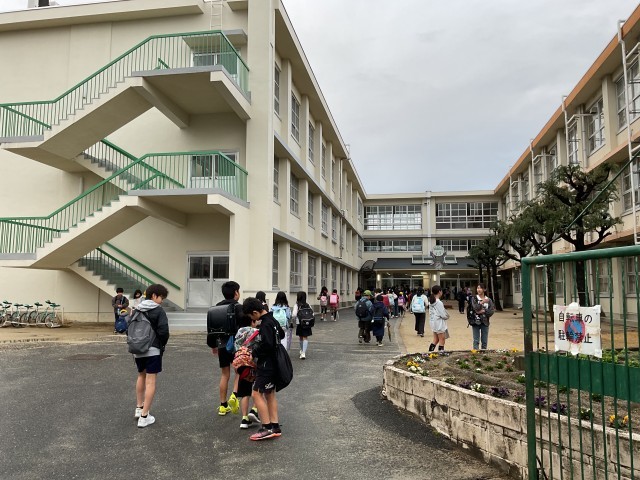 あいにくのお天気ですが、子どもたちは「おはようございます!」と元気に登校。