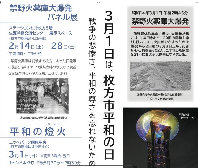 3月1日は、枚方市の「平和の日」です(イベント紹介) 公開日 2026/01/08 更新日 2026/01/08 お知らせ・緊急連絡 ひらかた平和フォーラム(お知らせ) ↓この機会に、「平和」について考えてみませんか? いいね(0)