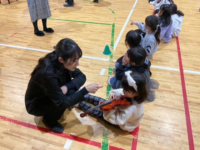 また、バイオリンに触れる体験も。初めて触れた子も多いのではないでしょうか。