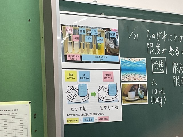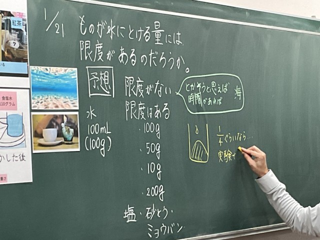 「ものが溶ける量には、限度があるのだろうか?」という問いに対して、子どもたちは、これまで学習してきたこと、普段の生活での経験などで得た知識や技能を用いて、この問いの答えを出していきます。
