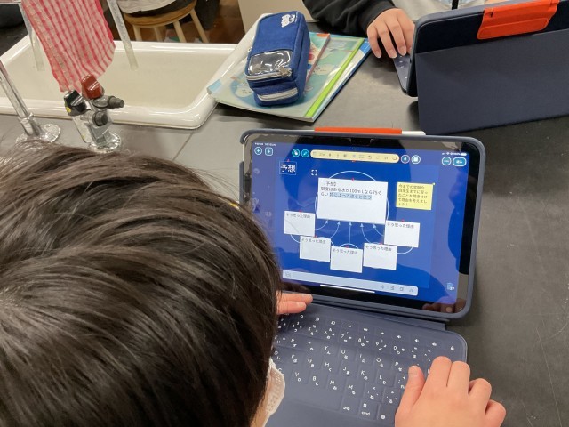 まずは、「限度がある」「限度がない」と予想をたて、その理由を明らかにします。タブレットに保存されたこれまでの学習内容も参考にしながら考えました。