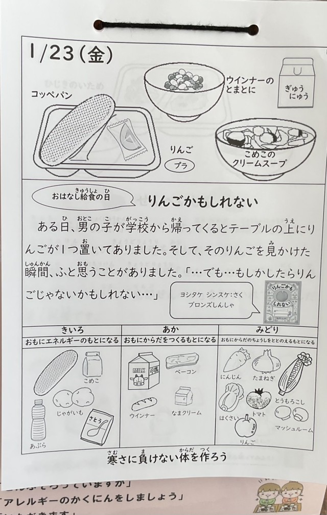 りんごも、たまに登場します。お家でも、栄養のバランスのとれた食事を心がけて、カゼに負けない体づくりをしましょう!