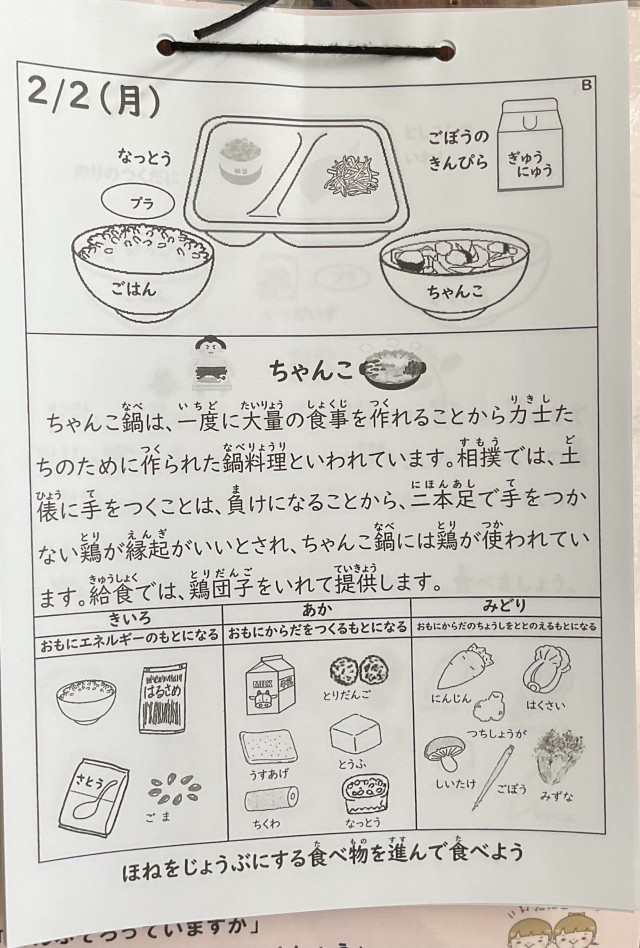 2月に入りました。メニュー表には「ちゃんこ」についての説明がありますが、今日は年に1回ほどしか登場しない「納豆」も出ました。