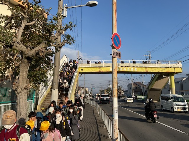 多くの子どもたちが渡ってくる歩道橋の一部で、凍っているところがあったようです。(子どもからの報告)