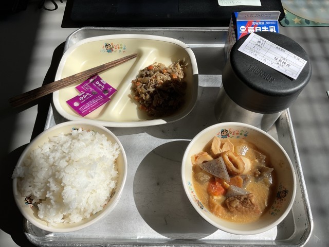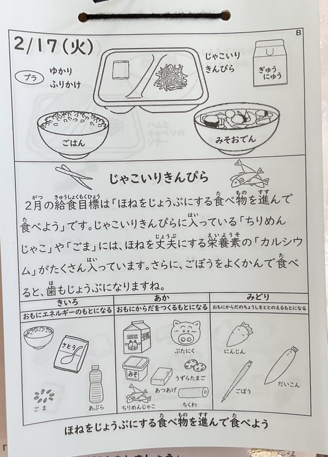 きんぴらごぼうに、じゃこも混ざられたメニューです。食べやすいメニューで、骨も丈夫に!
