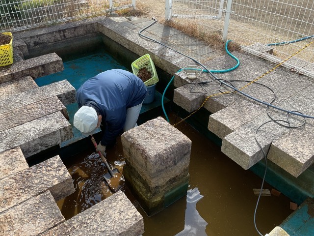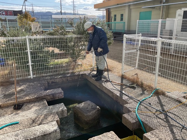 今日も校務員さんが、学校のため、子どもたちのために環境整備に取り組んでくれています。今日は中庭観察池の清掃を施してくれていました。昨年に東香里中学校生徒が職業体験で、中庭の観察池を清掃してくれました。しかし、その後池の水が濁り、金魚等観察できなくなり、再度清掃を施していただきました。おかげさまで、池の中の金魚等を観察することができました。いつもありがとうございます。