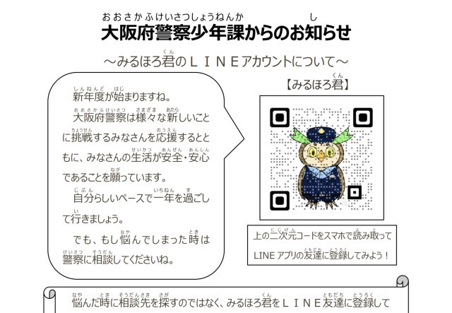 子どもたちの「SOS」を受け止めてくれる窓口の1つです。 → けいさつでも「LINE相談」しています(大阪府警察)