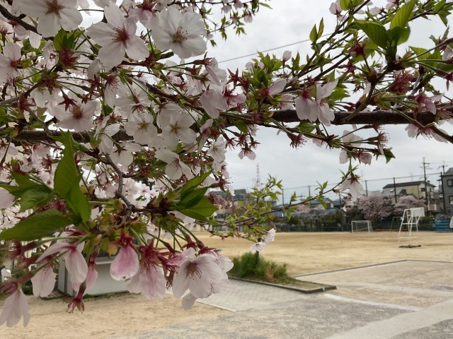 昨日の入学式には、どうにか咲いていた桜。散り始めています。でも、葉桜も綺麗ですね。