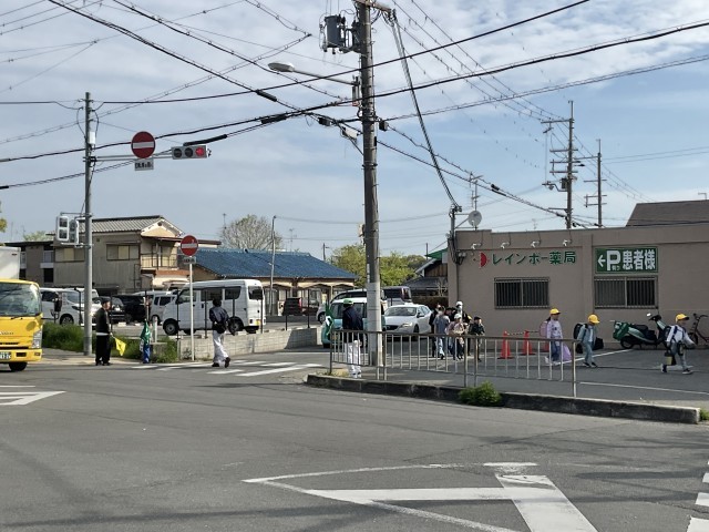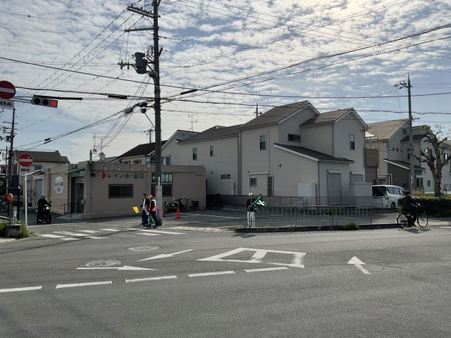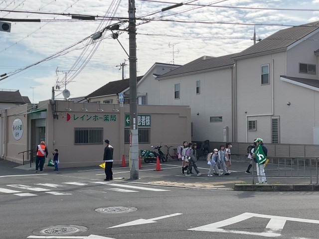 子どもたちの登校に合わせて、交差点などの各地点に旗を持った保護者や地域の皆様が、子どもたちの安全を見守ってくださっています。