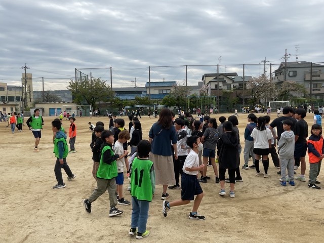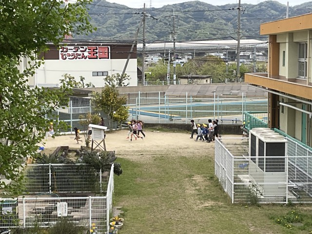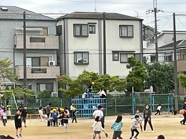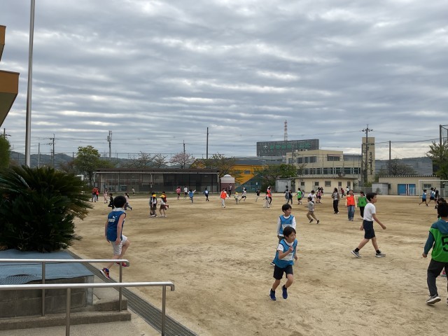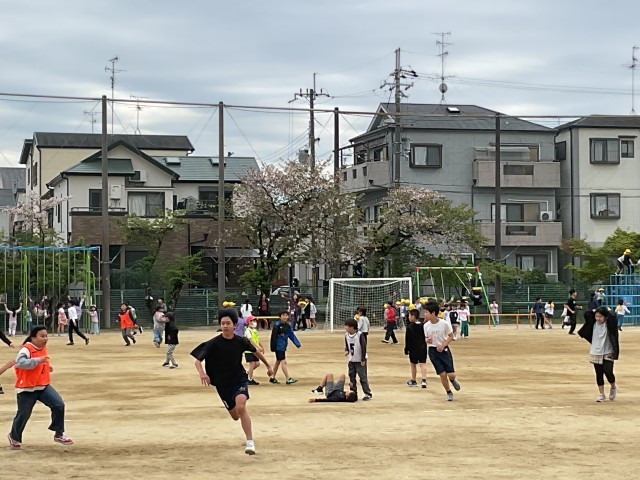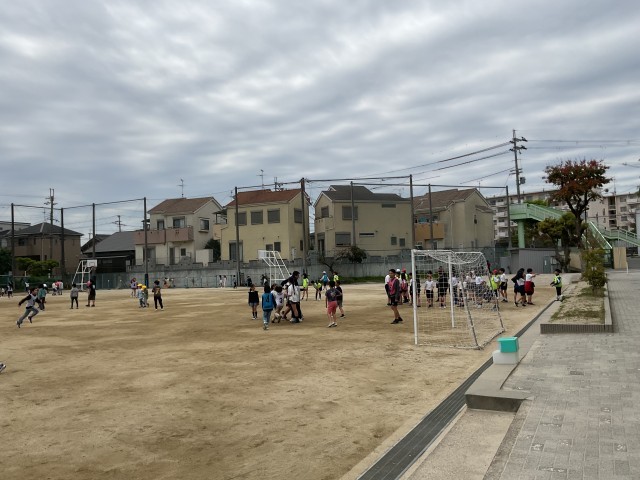 20分休み。運動場に出て遊ぶ子どもたち。先生も混じって、運動場を走り回っています!