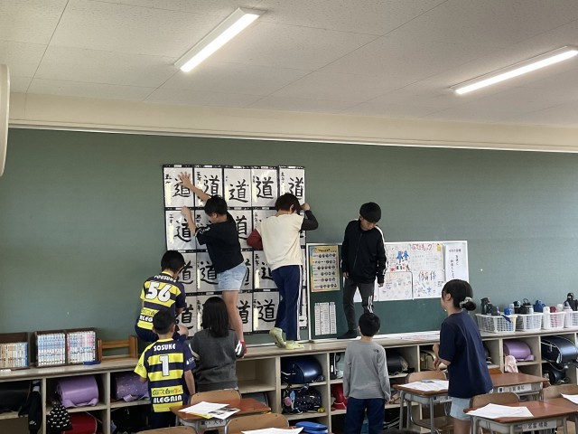 お習字の時間。心を込めて書いた作品を教室に掲示します。