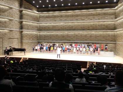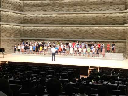 4年ぶりに合同音楽会が開催されましたが、1年半前に完成した枚方市総合芸術文化センタでの開催は初めてでした。今日から3日間開催されますが、春日小学校は初日の今日が出番でした。大きくてキレイなホールに圧倒されながらも、たくさんのお客さんの前で堂々とした姿で「素晴らしい言葉」「ツバメ」の2曲を披露しました。指導に来てくださった田口先生のアドバイス通り、元気な声ではなく、キレイな「歌の声」を意識して練習を積んできた甲斐もあって、本番も素晴らしい「歌の声」をホール中に響かせてくれました。とっても素敵な歌声で観客席で感動していました。