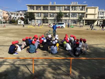 今日の2時間目に3年生は、運動場で枚方自動車教習所の担当者より、自転車交通安全教室の授業を受講しました。正しい自転車の乗り方、運転中の安全確認など、実際に運動場で自転車に乗りながら体験学習に取り組み、安全な自転車の乗り方や自転車の運転等について学びました。