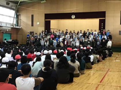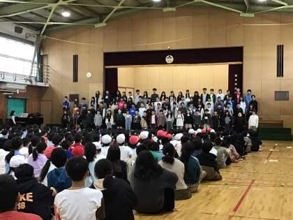 最後に6年生より、修学旅行の報告がありました。修学旅行で学んだ平和への誓いと核兵器のない世界への願いを最高学年として全校児童に伝えました。また、「HEIWAの鐘」の歌唱を披露してくれました。とても美しい合唱でした。