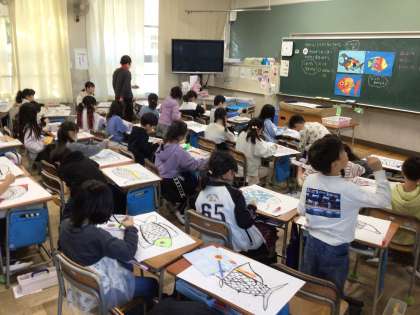 今日の1時間目の2年生の授業の様子です。1組は算数の授業で、かけ算の学習で動画を見ながら九九をみんなで発表した後は、「8のだんの九九のきまりを考える」学習に取り組んでいました。2組は図工の授業で、「せかいに1つだけのさかな」の学習で、クレヨンで描写した魚のウロコを1まい1まいかがやく色をぬる学習に取り組んでいました。