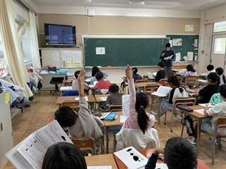 国語の授業をしていました。子どもたちはビーバーの体の秘密について文章から読み取って考えていました。途中、ビーバーの「お」がオールに似ているという表現の中で、「お」とはなにかについて考える際には「あし」だという人と「尻尾」だという人がいて話し合いましたが、「教科書の写真に尻尾がオールみたいになってのがある」という人が現れ、「ほんまや」「これか!」となりましたが、次は「オール??」「舵をとる??」となり、みんなで「オールで漕ぐ」マネをしていました。確かに「オール」をみたことも「漕いだ」こともない人が多い中で、文章からその様子をイメージするのは難しいですね。そんな時はみんなで知恵を出し合って答えをさがしましょう。