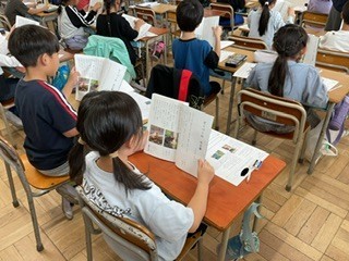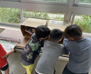 授業も終わって廊下に出ると、何やら人だかりが・・・何かなとみてみると動物にフューチャーした本が並べられています。いま国語で学んでいることにさらに興味関心を持ってもらえるように先生が工夫して設置したようです。学びは授業時間にとどまらず、広がっています。