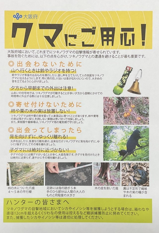 大阪府より熊出没の注意喚起のお知らせが届きました。