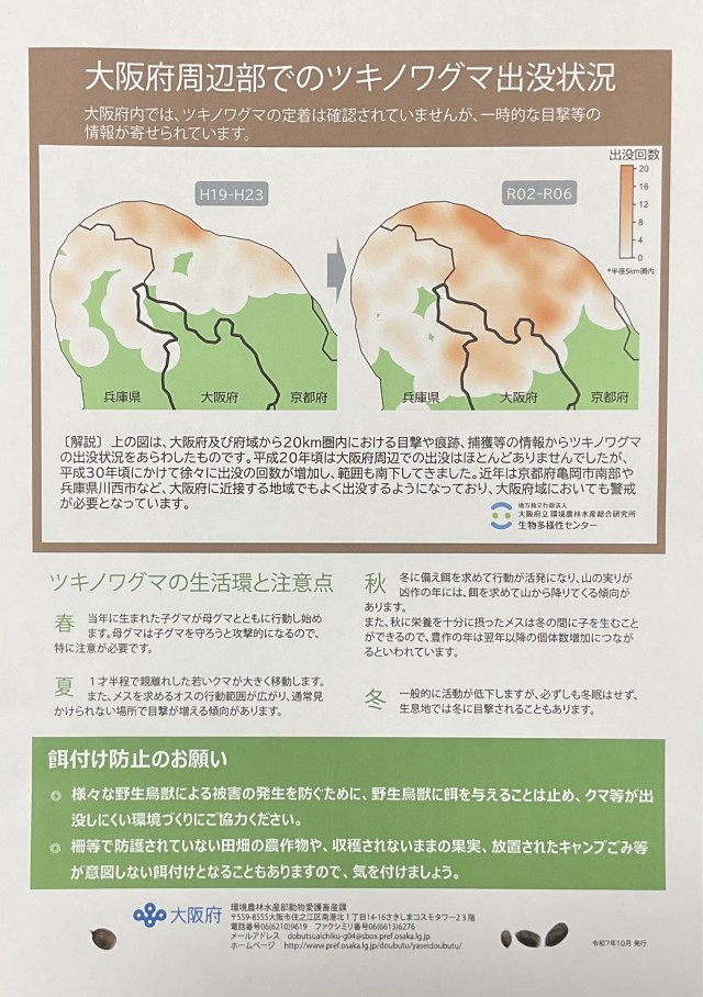 大阪府下でもツキノワグマの目撃情報があるとのことですのでご注意ください。