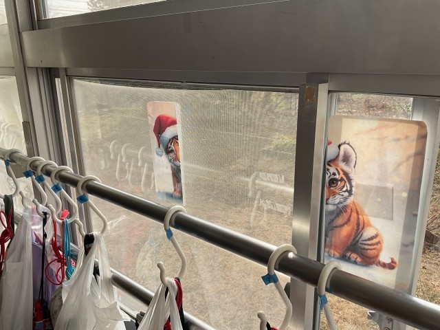 保健委員会の人たちが各クラスの窓に絵を貼り付けてくれています。この絵なんですが、窓が閉まっている状態ではバラバラになっていて、適切な間隔で窓を開けると、1枚の絵になるという仕組みです。